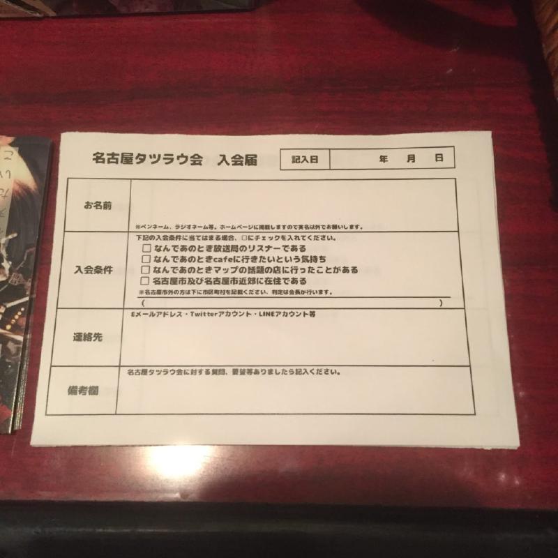 名古屋タツラウ会の入会届を作ったので、なんであのときカフェのレジ前に設置させていただきました。もし入会希望の方がいらっしゃいましたら記入の上、トクマスターに提出してください。