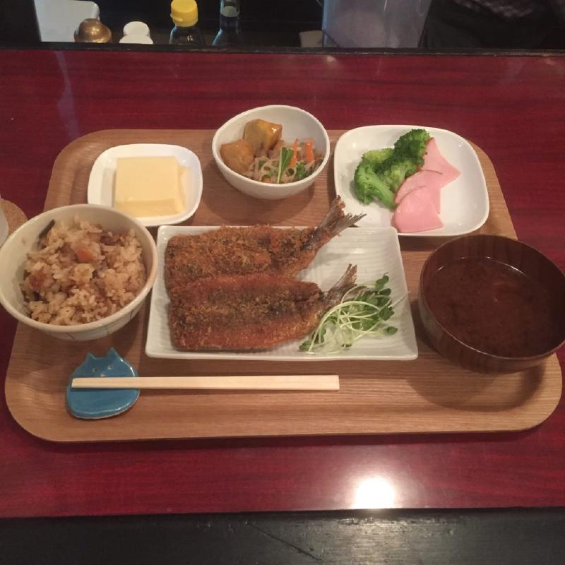 炊き込みご飯、イワシフライの晩ご飯定食。