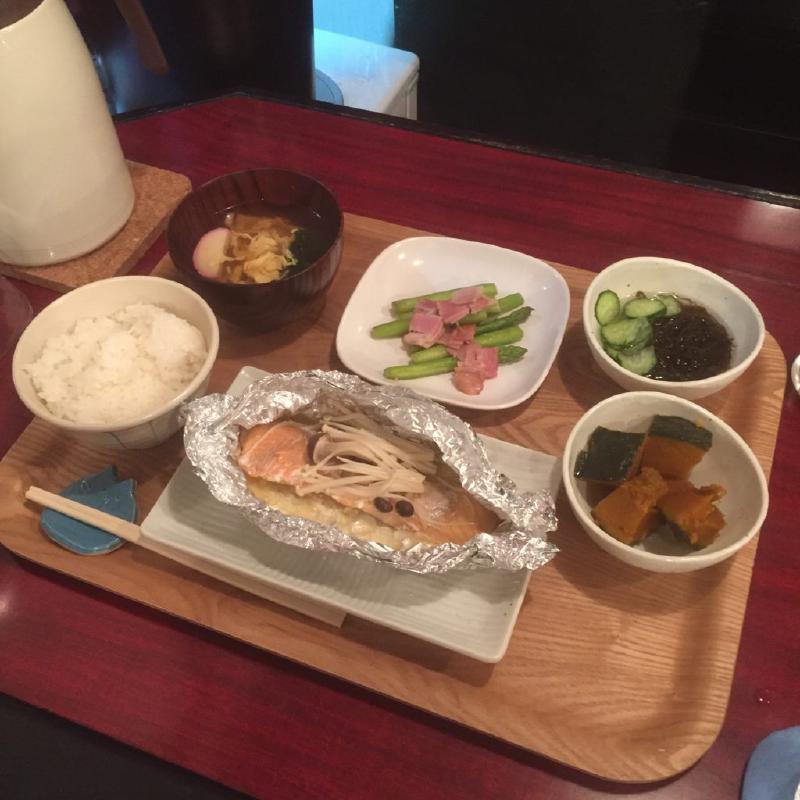 トクマスん家の晩ご飯定食は、鮭のホイル焼き、かぼちゃ、もずく等々。