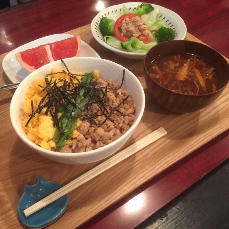 晩ご飯定食は、鶏そぼろ三色丼。