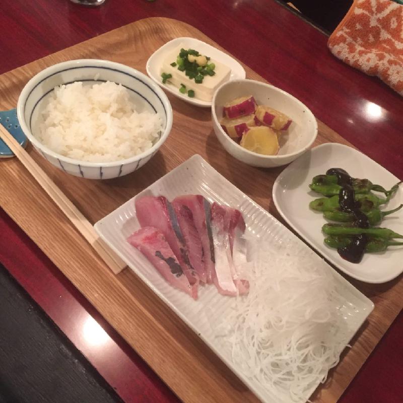 晩ご飯定食は、ブリ刺身、ししとう甘みそ炒め。