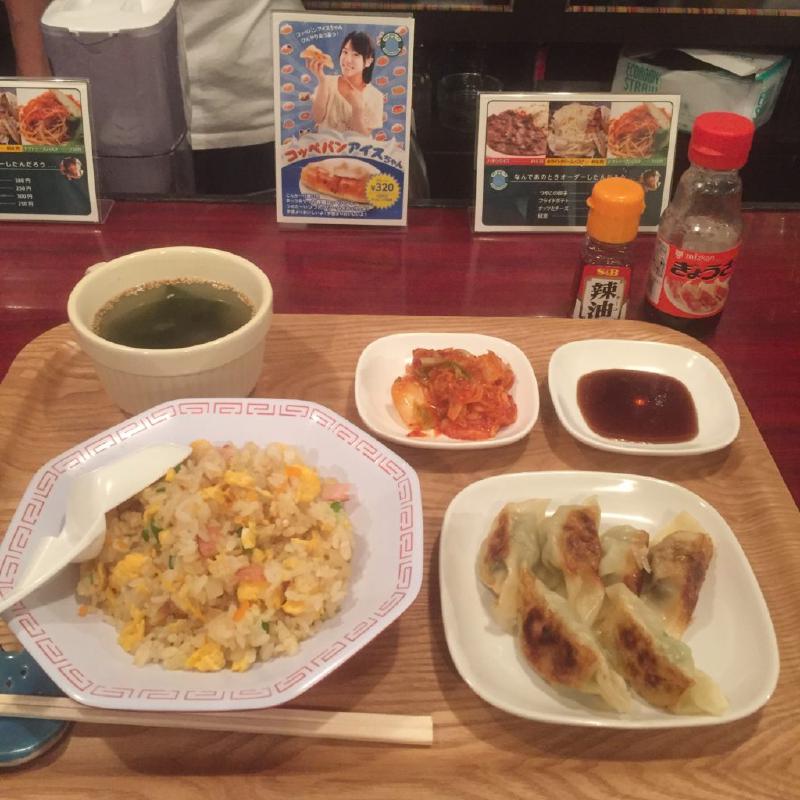 中華な晩ご飯でございます。チャーハン、ギョーザ、キムチ。