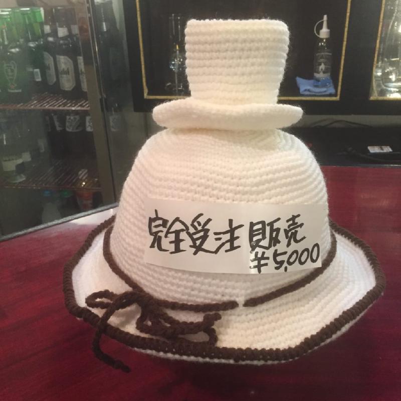 カフェラテが乗った毛糸の帽子です。カフェのお客さんが作ってくれました。こちらは受注販売も行うとのこと、実物はカフェにありますので見に来てね!