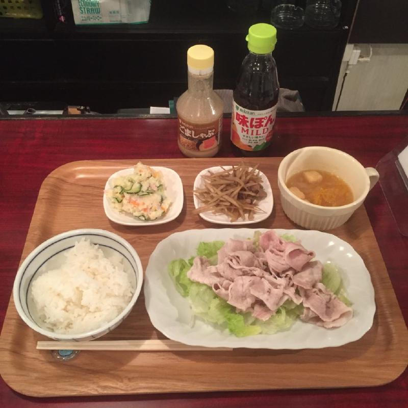 本日のディナーは、豚の冷しゃぶ、きんぴらごぼう、ポテトサラダ。
