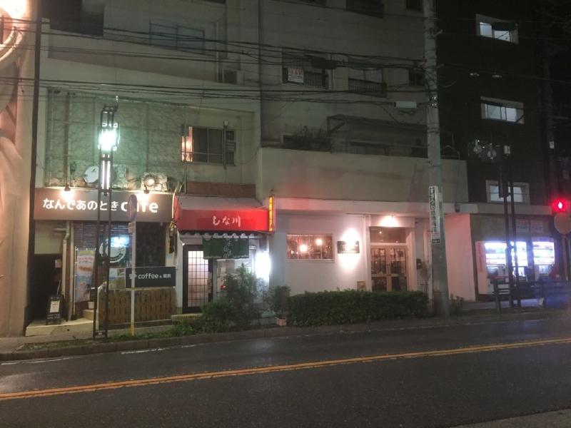 位置関係をお知らせいたします。写真の左から「なんであのときカフェ」「しな川」「その灯ぐらし猫洞店」「自販機コーナー」です。