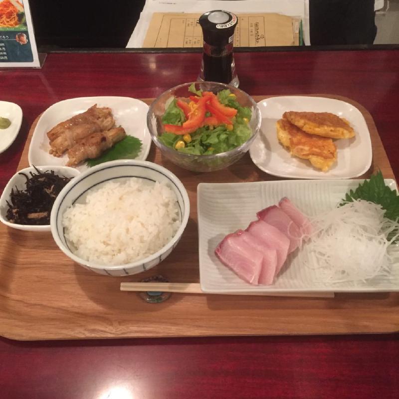 晩ご飯定食は、ぶり刺身、えのき肉巻きでした。今週もごちそうさまでした!