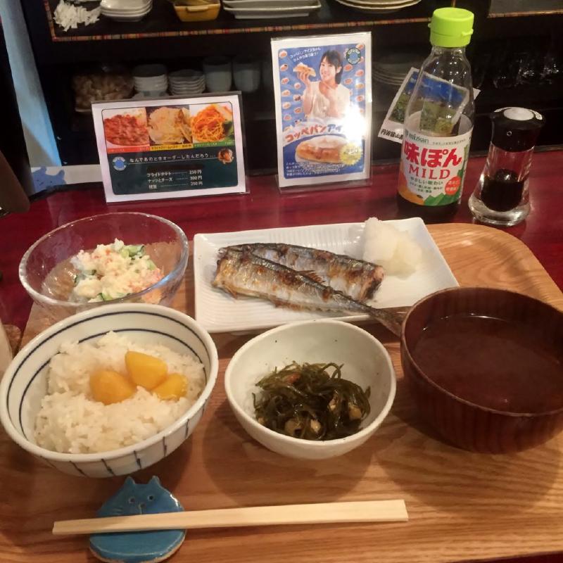 晩ご飯定食は、栗ご飯にサンマ塩焼きです。
