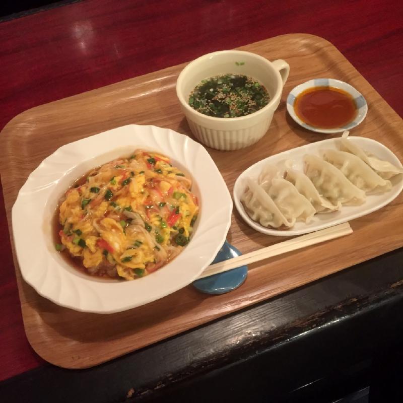 トクマスん家の晩ご飯定食は、天津飯と餃子です。