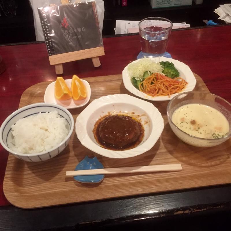 晩ご飯定食は、煮込みハンバーグです。明日はボーカリストsasayama.さんのライブ!