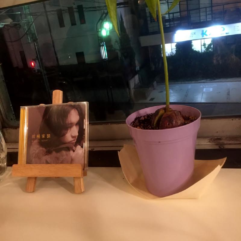 窓辺に川崎家狼さんのCD(非売品とのこと)がありました。横にあるのはアボカドです。