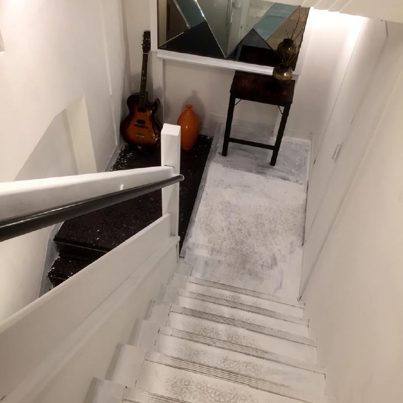 階段部分の壁紙が取り払われて、白ペンキで塗られてました。お店が明るくなりましたね。