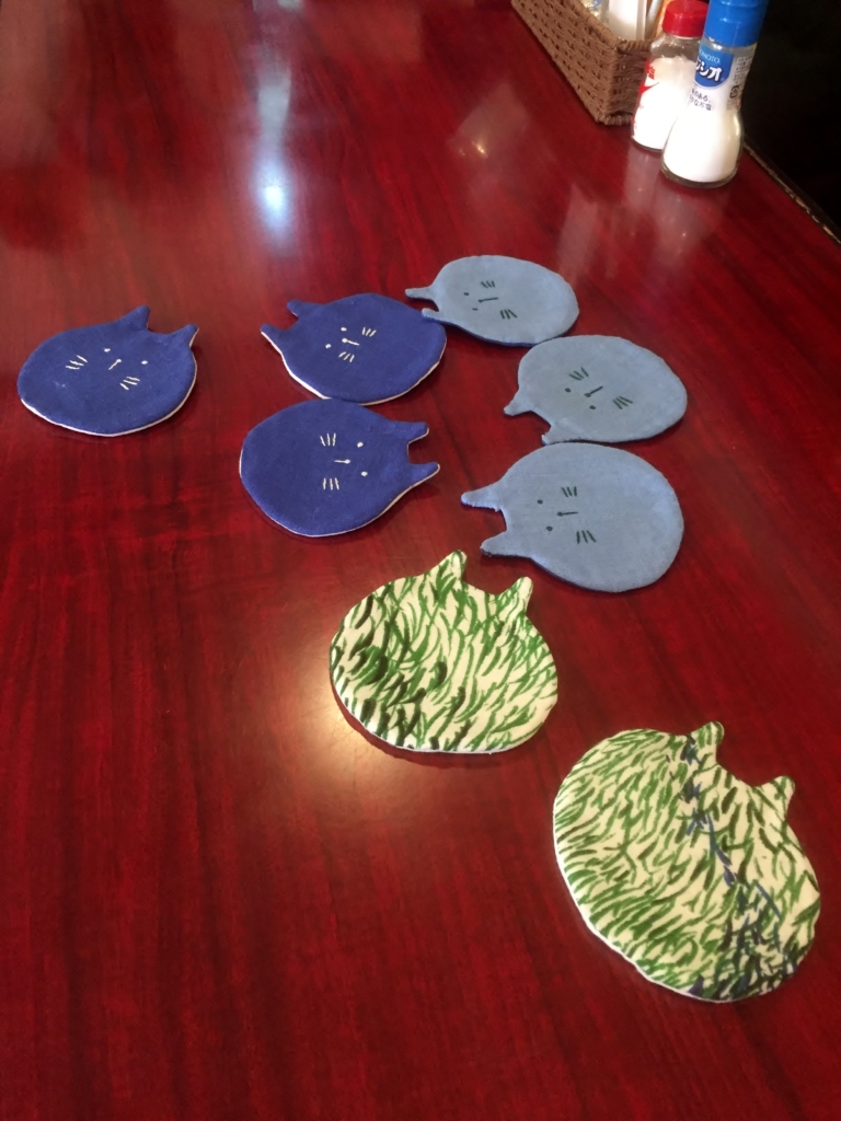 コースターのニューバージョンがカフェにありました。濃い青色と草の柄のタイプが新しいものです。