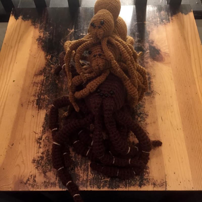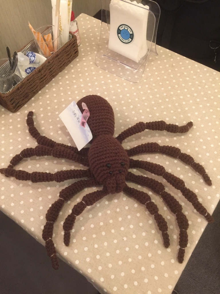 タランチュラのあみぐるみをテーブルに置いてみました。こちらのタランチュラは売約済みです。