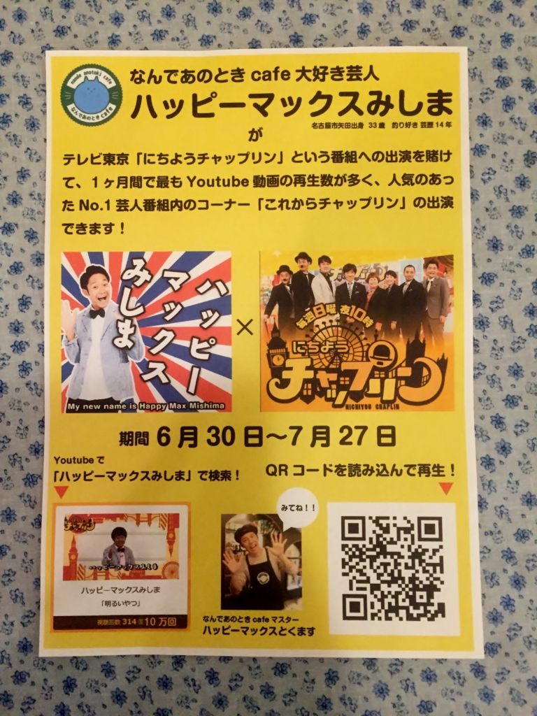 トクマスターの留守中に名古屋出身の芸人「ハッピーマックスみしま」さんが来店し、いろいろやってくれたらしいです。たくさん書いてありますがYouTubeの動画がたくさん再生されるとTVに出れるようです。 というわけで、見よう!ハッピーマックスみしまの動画!