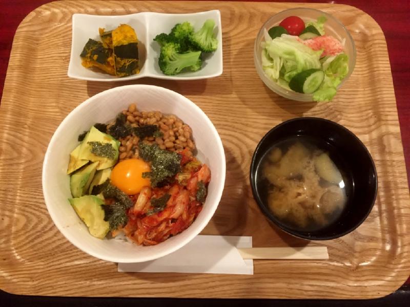 トクマスん家の晩ご飯定食は、キムチ納豆アボガドの三色丼です。