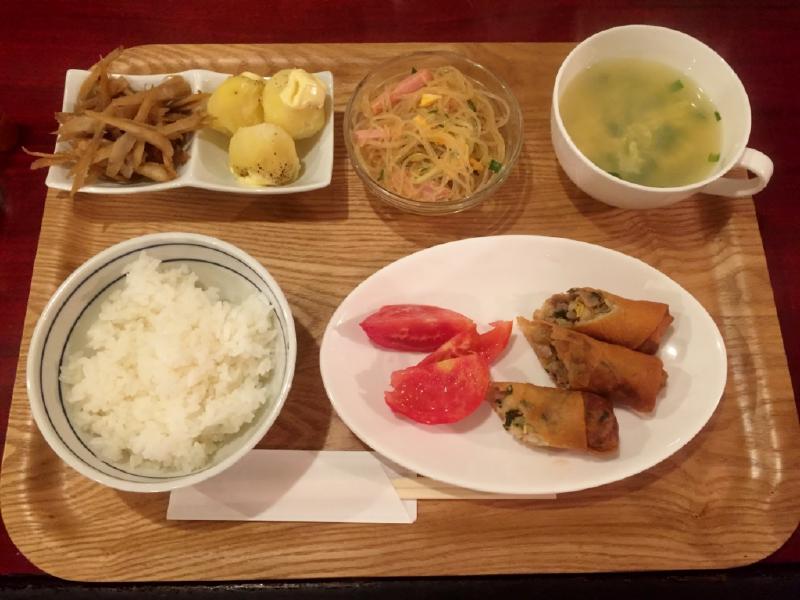 晩ご飯定食は、春巻き。付け合わせのトマトとジャガイモは、なんであのとき村産でございます。
