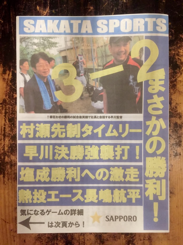 坂田酒販 vs 瀬戸市役所の草野球の結果です。3-2で坂田酒販がまさかの勝利!