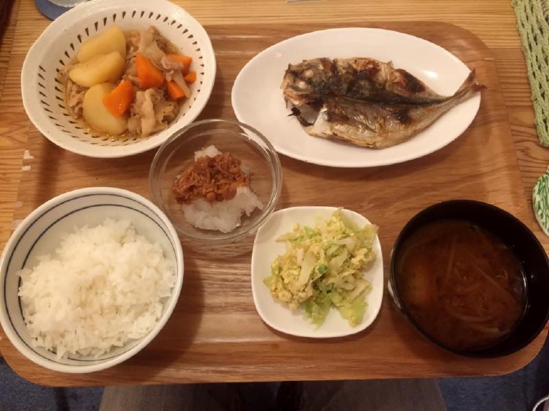 トクマス家の晩ご飯定食は、焼き魚と肉ジャガです。