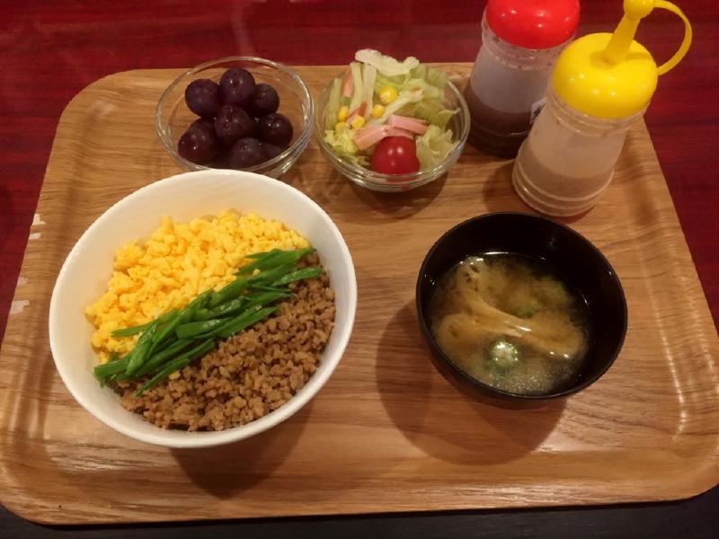 晩ご飯定食は、三色丼です。ぶどうも付いてました。