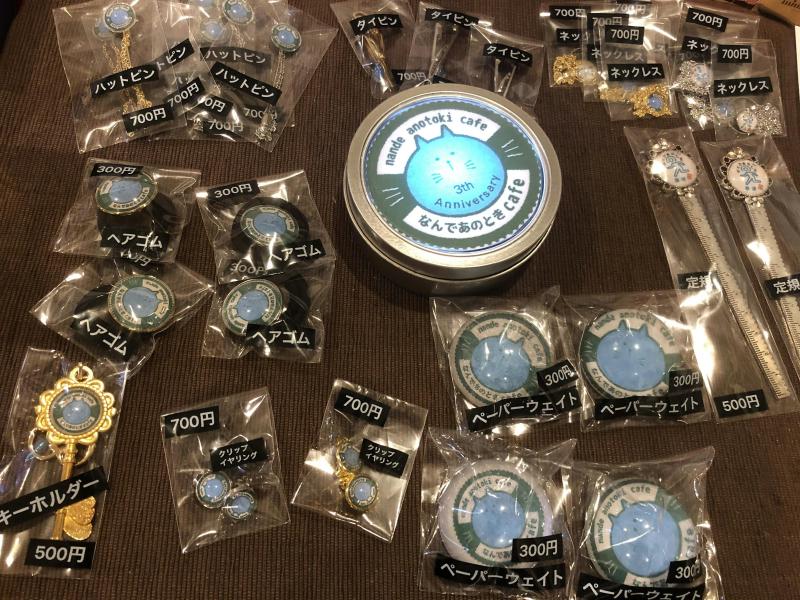 ハットピン、タイピン、ネックレス、ヘヤゴム、定規、キーホルダー、クリップイヤリング、ペーパーウェイト等々。そしてなんと売り上げはカフェに寄付してくださるとの事です。マジで助かります!マジでサンクス!!!