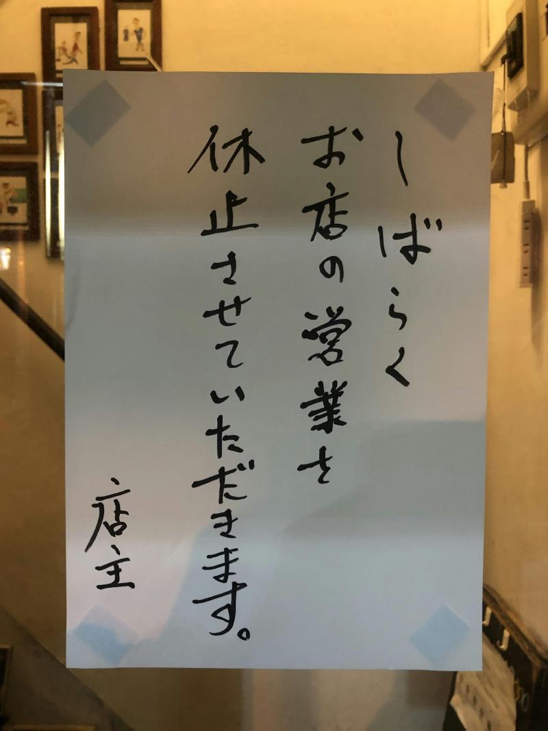 「しばらくお店の営業を休止させていただきます。店主」の貼り紙が入り口にあった。