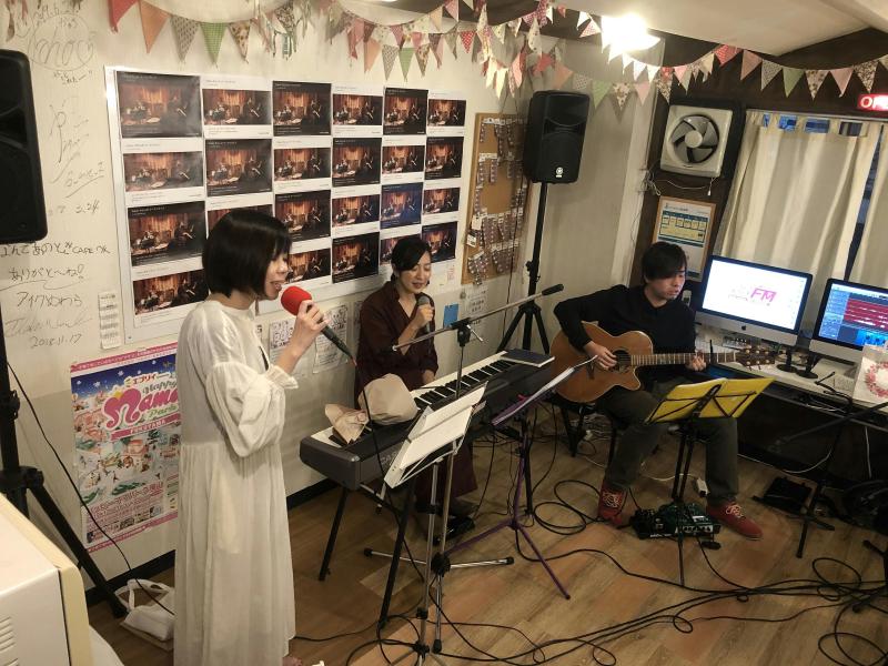 写真はアンコールの際に演者の皆さんでカバー曲を披露されているところ、左からFumiさん、そらしのさん、そしてFumiさんのサポートで来てくれたニイミイサオさんです。暖かいお客様と温かいファンヒーターのおかげでステキなライブになりましたね。 今回の演者の皆さんの今後のライブ情報などは下記の公式サイトをご参照ください。