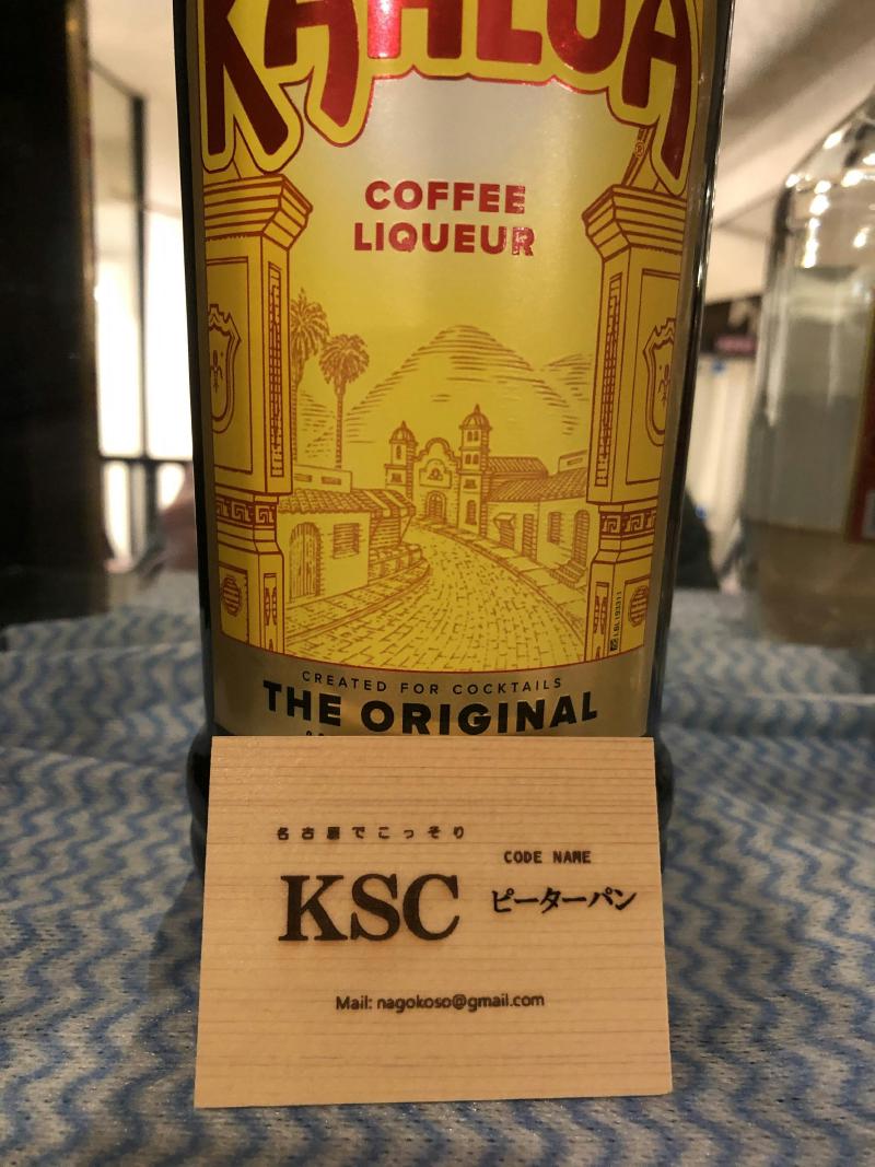 KSCメンバーは木名刺を持っている人もいます。これは昨年2019年に開催された名古屋でこっそりトークライブで作ったものです。コードネーム「ピーターパン」は、タツラウです。たまたまお酒の前に置いてあるけどキープしてる訳ではない。