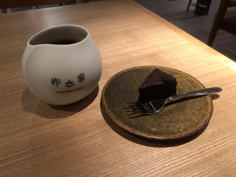 アイスコーヒーもケーキもオシャレな器でやってきました。お茶請けのケーキは砂糖を使わないというこだわりの品です。