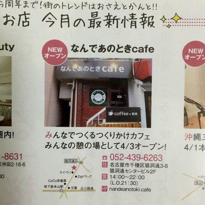 千種フリモにオープン情報掲載2016/03/26タツラウ千種フリモは無料です、名古屋市千種区のサークルKに置いてあります。みんなでつくるつくりかけカフェ、みんなの憩の場として4/3オープン!【なんであのときcafe】住所: 名古屋市千種区猫洞通3-8 猫洞通センタービル2Fアクセス: 地下鉄 東山線・名城線 本山駅より北へ徒歩8分くらい営業時間: 14:00 - 22:00 (L.O. 21:30)定休日: 火曜日駐車場: ありません(付近にコインパーキングあります) なんであのときcafeは2022年6月に閉店いたしました。著者タツラウなんマガ編集者